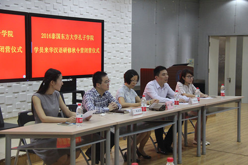 国际合作学院副院长陈军,泰国东方大学孔子学院院长章毓林均出席开营仪式并发表讲话,老师们对参加此次秋令营的泰国学生给予欢迎并寄予若干期望,汉语研修秋令营学员代表张雷同学发言回应。