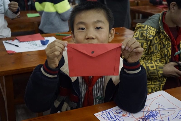 有的在纸上画出一个会飞的自己,期盼自己能够飞翔。还有的小朋友在纸上写着“在新的一年里希望总是一个人吃饭的奶奶不再孤独!”简简单单的字却是心里最殷切的希望。志愿者也给各位努力的小朋友分发了零食作为奖励。在红包制作环节,志愿者耐心的教孩子们制作出一个又一个红包,并教他们折一些爱心、千纸鹤等作为红包的装饰。活动进行到最后,志愿者们也现场制作了一幅充满爱心的海报,每个小朋友都在上面留下了自己的名字和红包,希望在这个冬天送去新年的祝愿。