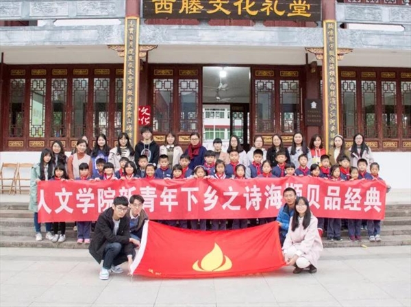 11月22日,我校免费色情片 思源青年志愿者协会来到芙蓉镇西塍文化礼堂,携手芙蓉镇政府和雁湖九年一贯制学校共同举办了免费色情片 新青年下乡之“诗海撷贝品经典”活动。