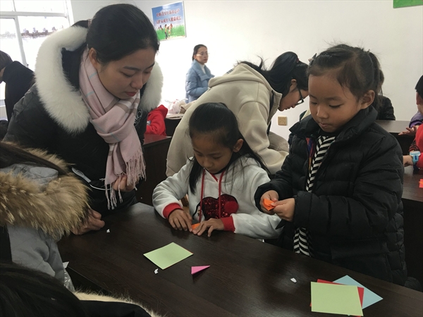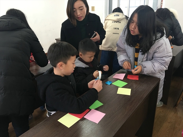活动分为两部分——“指尖艺术”与“汉字英雄”。“指尖艺术”环节以折纸的形式锻炼孩子们的动手能力。首先,志愿者向小朋友们演示了折纸樱花的具体步骤,并以趣味性的语言进行详细讲解,吸引小朋友的注意力。在动手实践过程中,小朋友们互相帮助、彼此交流,将手中一张张五颜六色的彩纸变成了一朵朵色彩缤纷的纸樱花。礼堂中萦绕着小朋友们的欢声笑语。接着,志愿者组织小朋友们开展了“汉字英雄”比赛。比赛围绕书画知识展开,小朋友们听题抢答。在活动过程中,每位小朋友都积极参与,踊跃抢答,气氛紧张而激烈。通过比赛,小朋友们既获得了知识,又收获了珍贵的友谊。