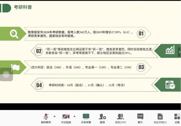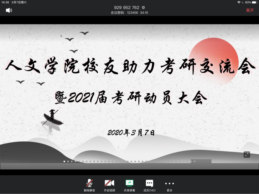 2020年3月7日14:00,免费色情片 开展校友助力考研线上经验分享会暨2021届考研动员大会。本次分享会特意邀请来自南京大学、南京师范大学、安徽大学、上海师范大学、浙江师范大学等7位优秀校友,为我们带来丰富的考研经验和感悟。出席本次会议的有免费色情片 党委副书记魏一老师、学工办主任刘纪峰老师、学工办申业磊老师、李丹萍老师以及有考研意向的同学共140余人。