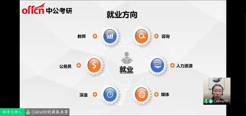 王讲师主要由以下三个部分展开:首先,她对目前考研形势进行分析,回顾往年硕士研究生报考人数,分析目前考研基本持逐年增长的态势;考生读研首要动机依然是要提高就业竞争力,她预测报考人数会持续高速增长。其次,讲师对目前就业方向前景进行揭秘,对文学类专业的工作岗位一一分析并且建议同学们尽量早完成择校择专业工作,事先了解高校专业培养目标、就业方向、招生情况后,再去选择适合自己的专业,而不是盲目追求热门专业。最后,王讲师热情邀请同学们加入中公教育的备考直通车,帮助考生们实时答疑、制定计划监督,以便备考的同学们更好地踏上考研之路。
