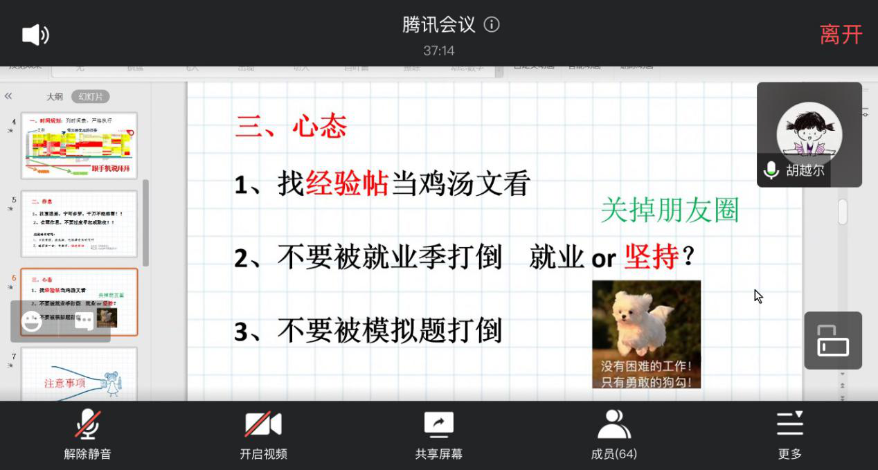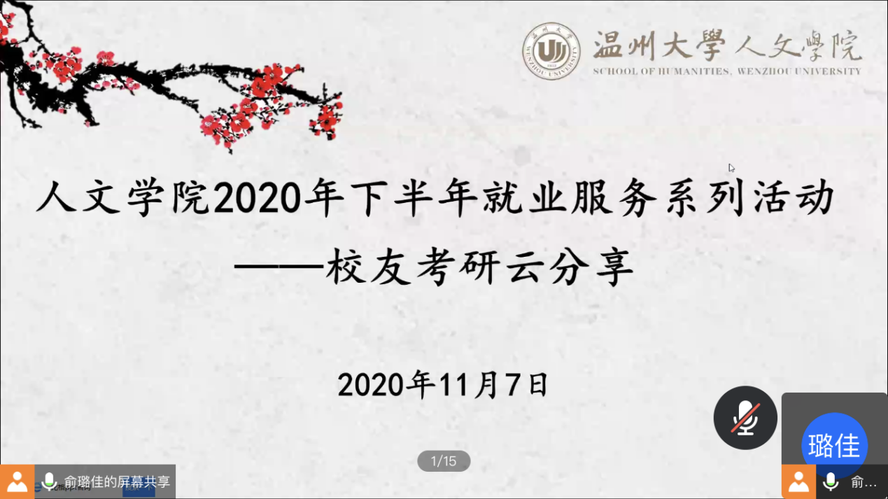 2020年11月7日晚6点30分,免费色情片 “2020年下半年就业服务系列活动之校友考研云分享”在腾讯会议上正式拉开帷幕。院学工办辅导员申业磊、李丹萍,4位优秀校友以及有考研意向的同学共60多人参加了此次分享会。