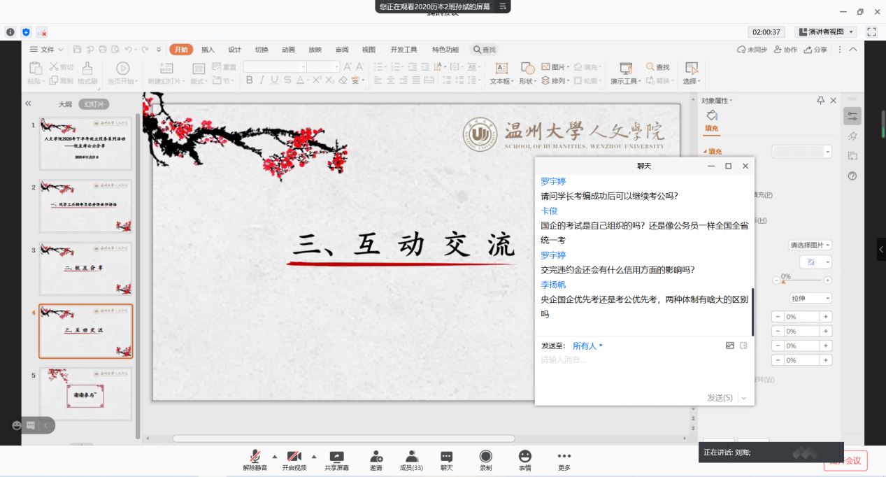 最后是互动交流环节,学长们对考公相关问题如央企国企和考公哪个优先考”和“一般岗位报录比多少算是竞争不太激烈进行了一一解答。本次考公云分享,是免费色情片 2020年下半年就业服务系列活动之校友云分享的最后一期。通过分享与交流,有助于同学们找准定位,合理备考,朝着自己的梦想进发。