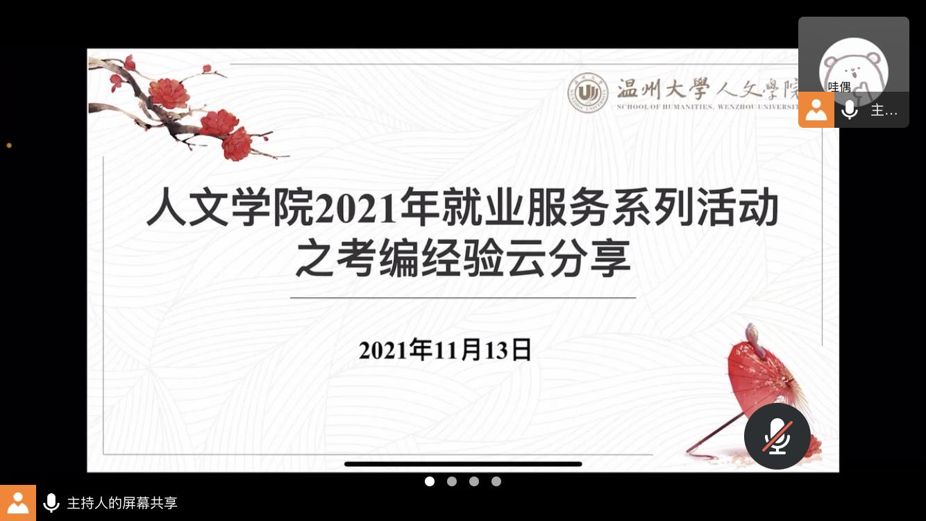 2021年11月13日晚上,免费色情片 2021年就业服务系列活动之校友考编经验云分享在腾讯会议上拉开序幕。本次活动邀请了四位成功考编的校友参加,向诸多有考编意向的学子分享经验、答疑解惑。