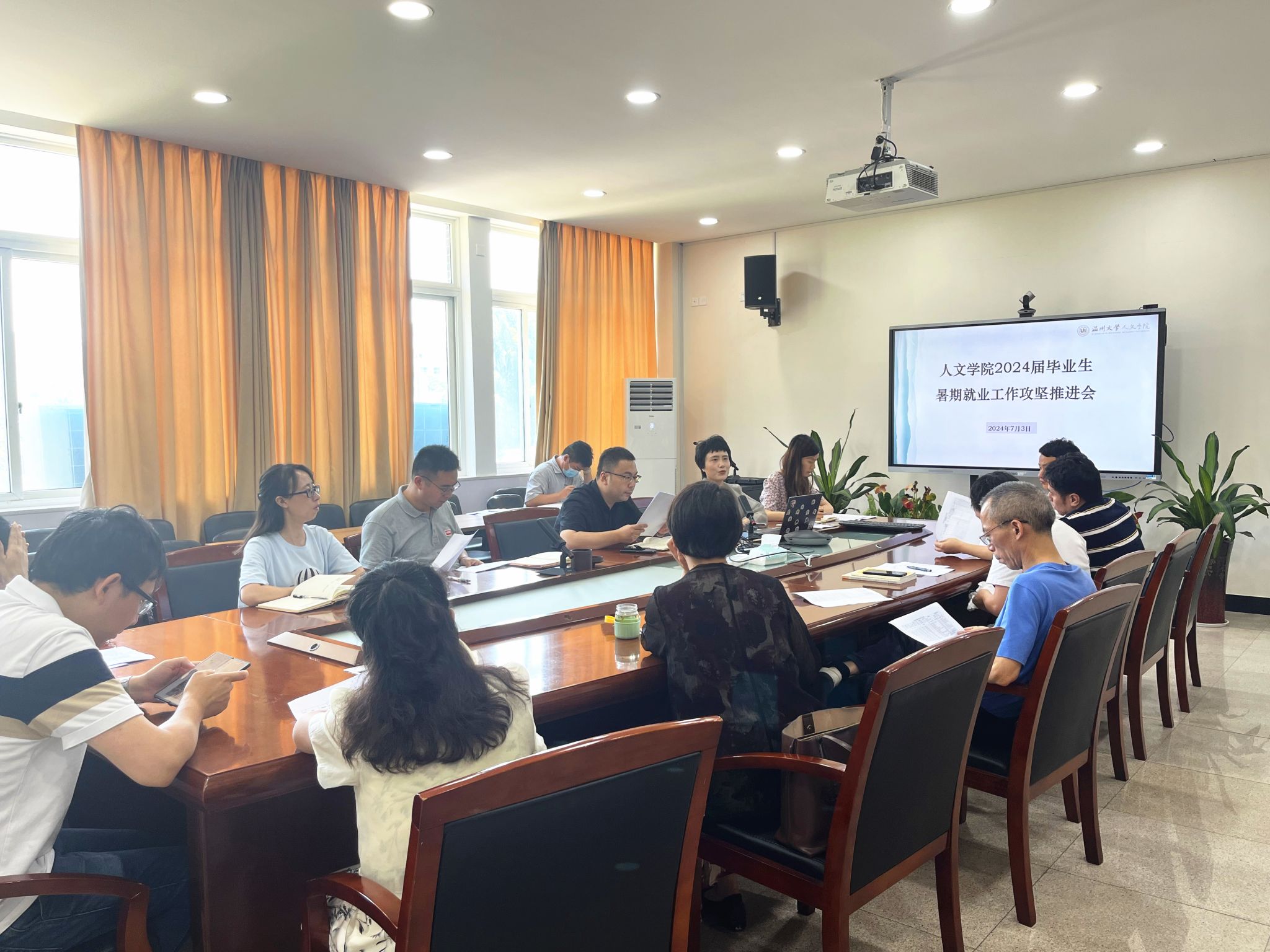 为进一步推动学院2024届毕业生就业工作,促进毕业生更高质量更加充分就业,7月3日下午,免费色情片 在人文楼213会议室召开了2024届毕业生暑期就业工作攻坚推进会,此次会议旨在深入贯彻落实教育部、省教育厅及学校关于高校毕业生就业工作的会议精神,抢抓就业冲刺期,明确后续工作重点,凝聚全院力量,共谋就业新篇章。学院领导班子全体成员、各专业系主任、硕士点负责人、毕业班班主任、学工办辅导员出席会议。会议由院党委副书记黄玮主持。