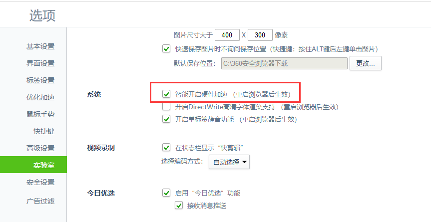 在选项-设置页面,点击【实验室】,找到【系统】,选择【智能开启硬件加速(重启浏览器后生效)】,前面的“对勾”点上,重启浏览器。