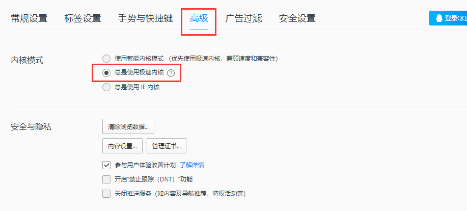 选择【高级】,找到内核模式,点击【总是使用极速内核】,重启浏览器。