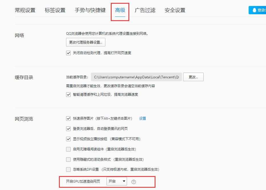 选择【高级】,找到网页浏览,开启【GPU加速渲染网页】。