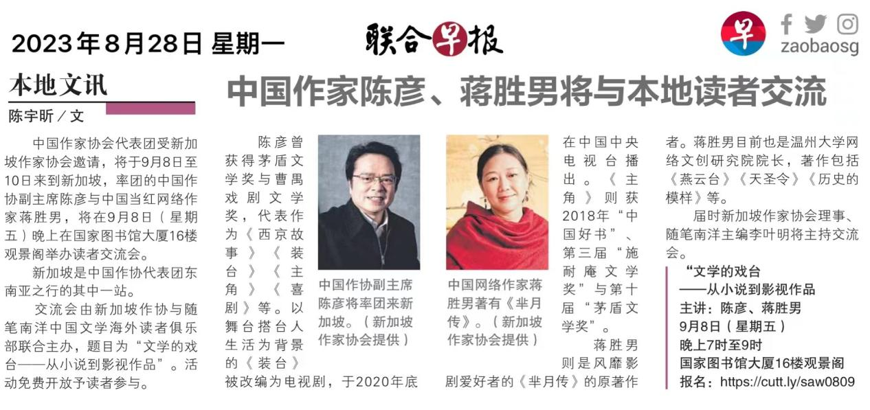 中国作家协会代表团受新加坡作家协会邀请,将于9月8日至10日来到新加坡,率团的中国作协副主席陈彦与中国当红网络作家蒋胜男,将在9月8日(星期五)晚上在国家图书馆大厦16楼观景阁举办读者交流会。