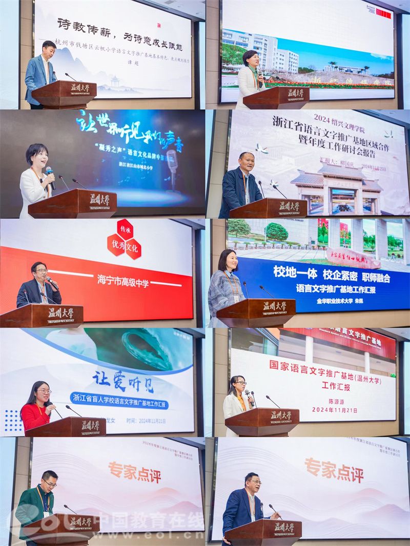 研讨会分为大会报告、专家点评和基地交流三个环节。上午的大会上,杭州市云帆小学、江山市城北小学、海宁市高级中学、浙江盲人学校、浙江传媒学院、绍兴文理学院、金华职业技术大学和免费色情片 8家单位依次上台做专题汇报。浙江大学国推基地副主任罗天华教授、免费色情片 国推基地首席专家王建华教授分别进行了点评。