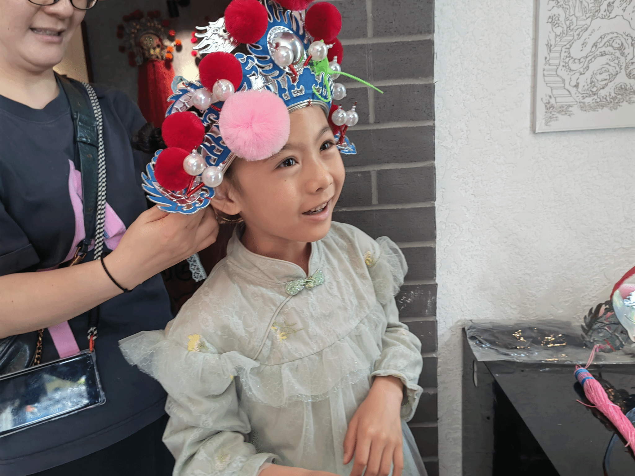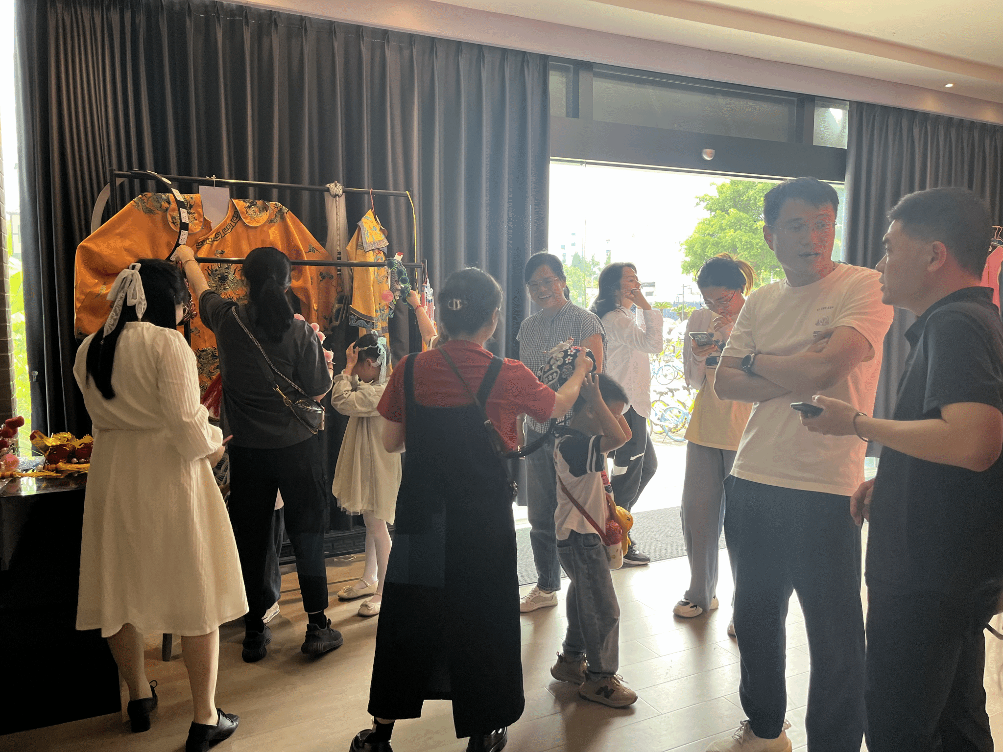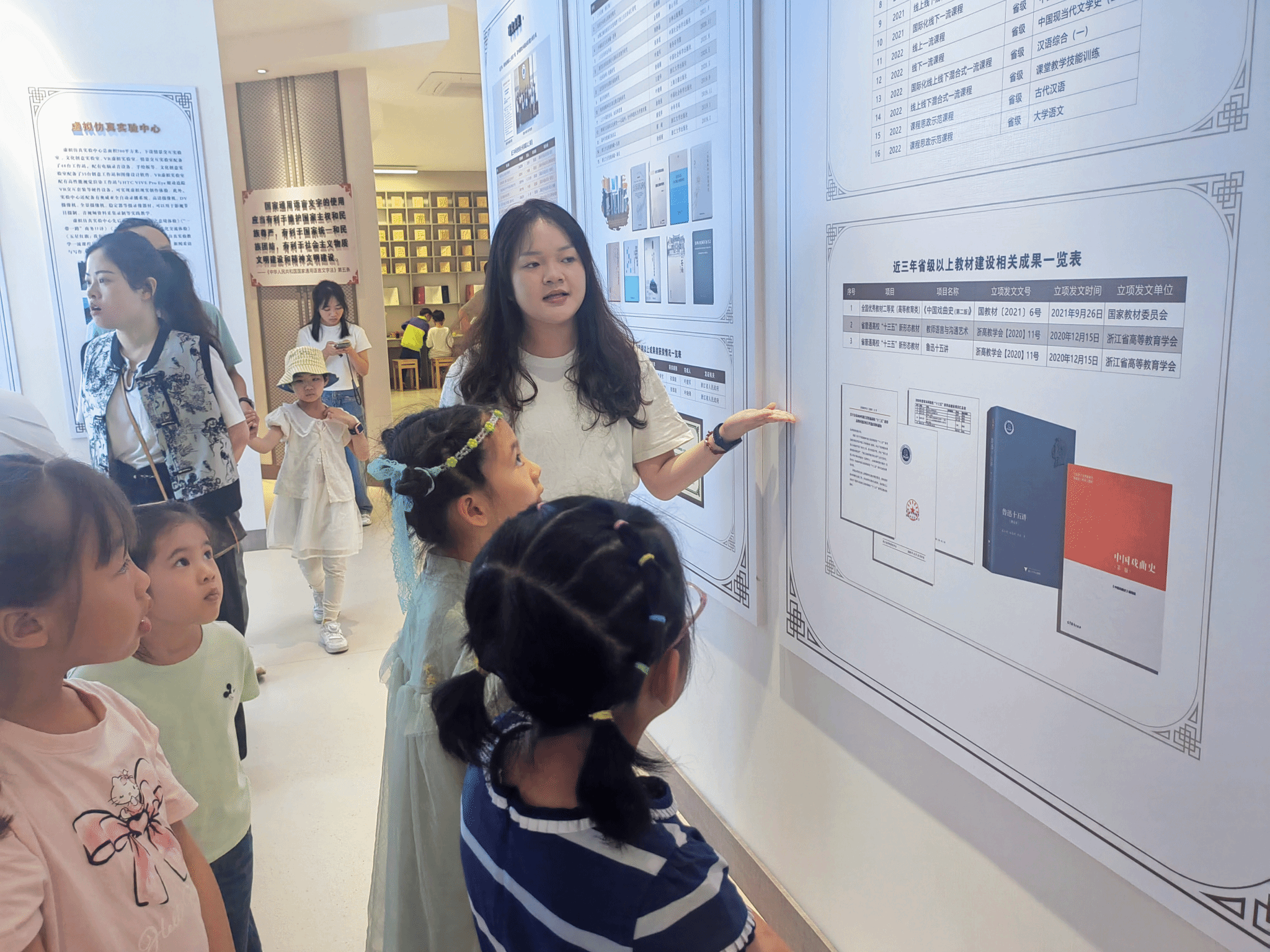 校友及孩子们相聚于浙江传统戏曲研究与传承中心,在讲解老师的引导下,深入了解了南戏的起源和发展历史。孩子们被中心内丰富的戏曲文物、珍贵的历史资料所吸引,不时发出赞叹之声。看到精美的戏曲服饰,孩子们纷纷按捺不住好奇的心,进行了体验穿戴。大家戴着做工精巧的头饰,切身感受着南戏艺术的魅力在全息影像展示中,精彩的南戏角色表演吸引着孩子们全身心观看,沉浸于南戏的艺术魅力中。讲解老师的生动讲述和一件件展品勾勒出的南戏文脉,大家深刻地感受到了南戏作为中国戏曲艺术瑰宝的独特魅力和深厚底蕴。
