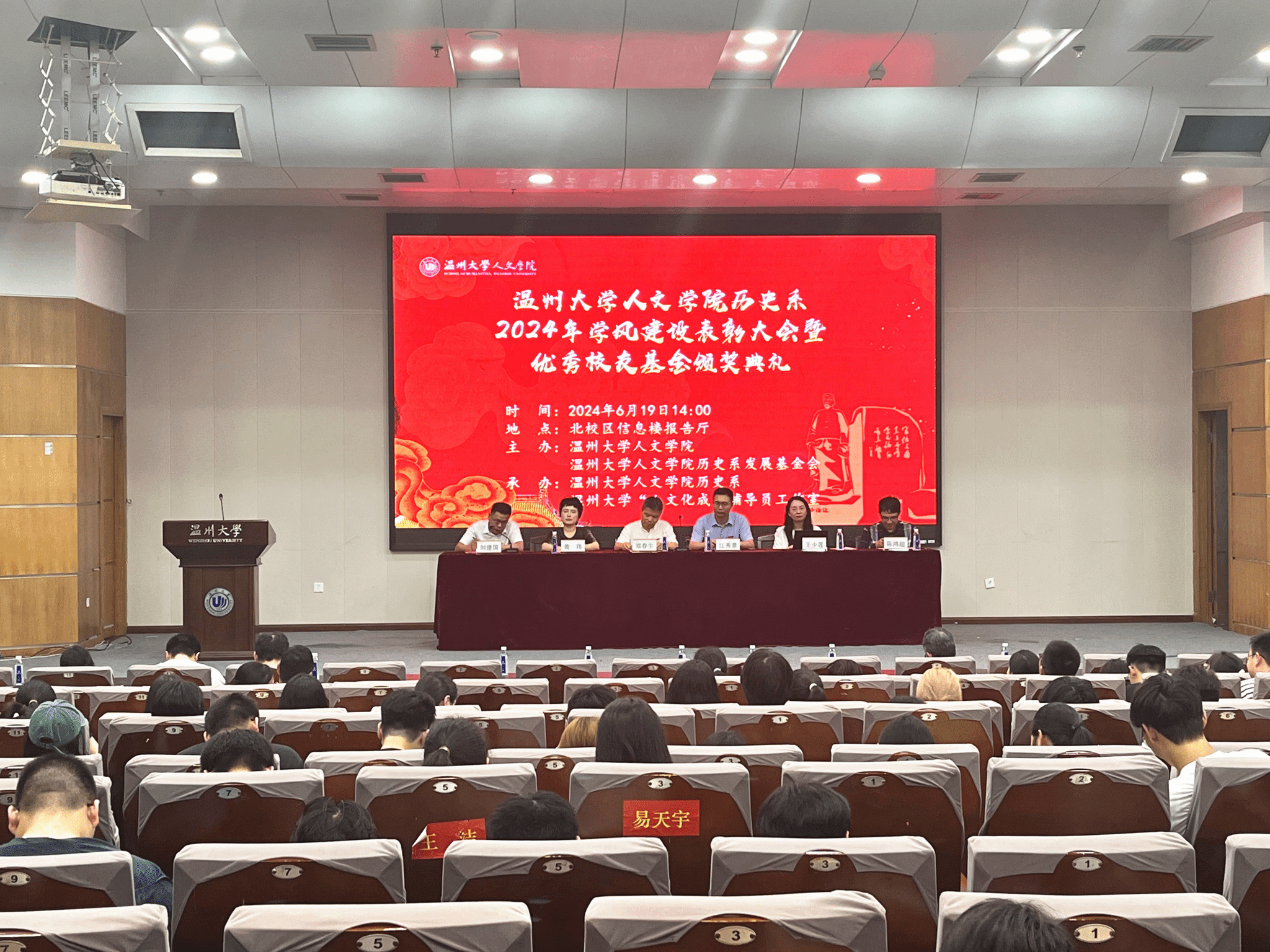 2024年6月19日下午14:00,免费色情片 历史系2024年学风建设表彰大会暨优秀校友基金颁奖典礼于北校信息楼报告厅隆重举行。大会由免费色情片 历史系发展基金会会长刘建国主持。免费色情片 党委书记江秀景、副院长郑春生、院党委副书记黄玮、历史系主任陈鸿超、97级历史本科校友王少莲、历史系教师代表以及历史系全体学生出席了本次大会。
