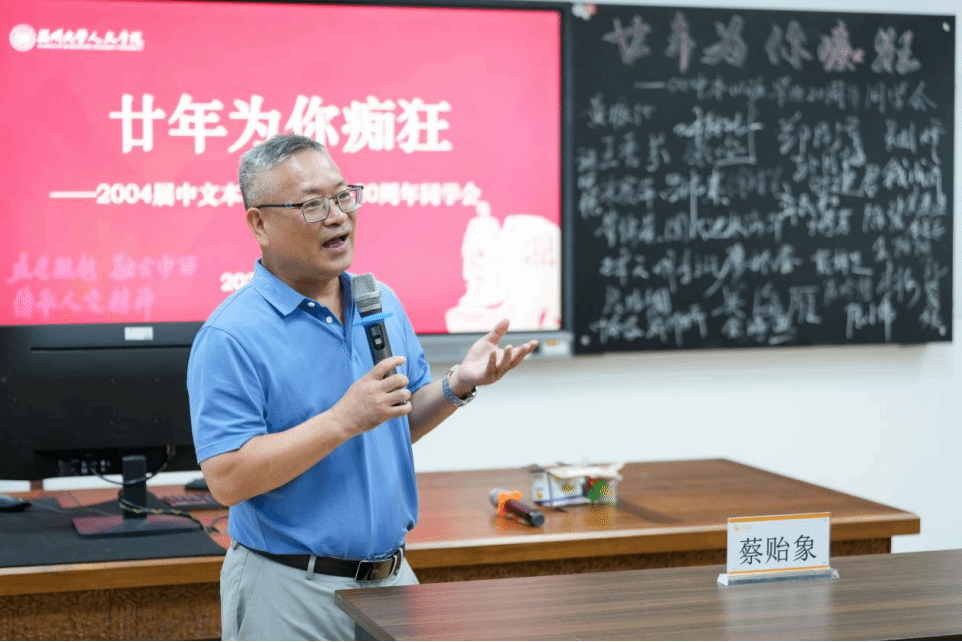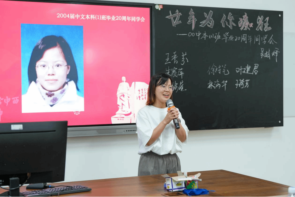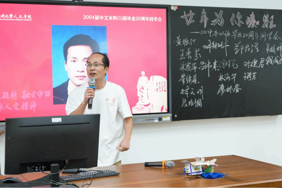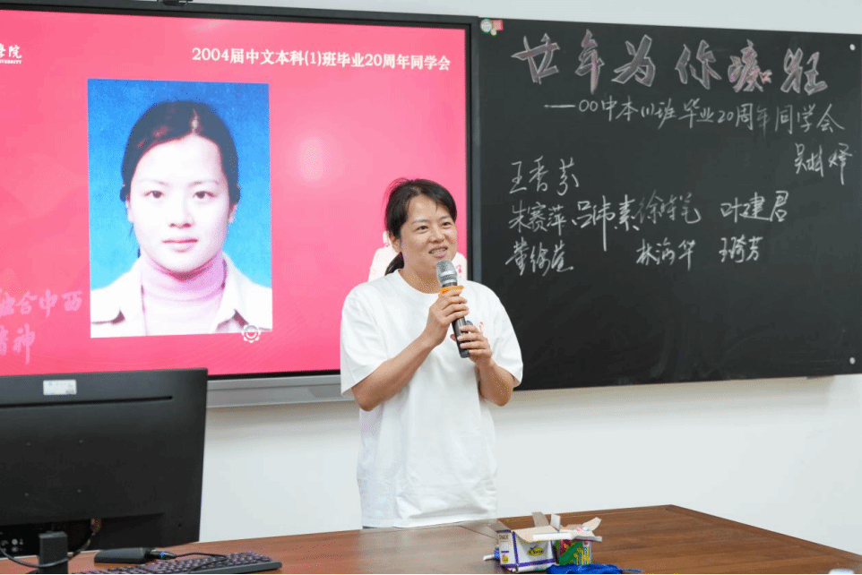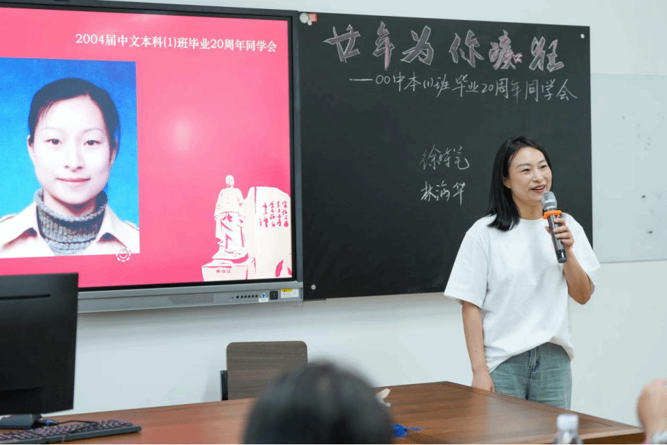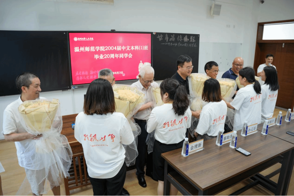 主题班会精心设置了重温课堂环节,骆锤炼老师为同学们献上了饱含深情的《当时我们选择了这座城市》俞磊老师分享了自己多年的写作教学体会与经验;金理新老师殷殷叮嘱大家要注重阶段和过程蔡贻象老师从同学们身着的文化衫上标语“狂飚廿年”切入,结合影视,为大家呈现了这20年的变与不变;林维民老师的诗歌课堂,深入浅出,看似刻板的经典名篇在他口中又生动鲜活了起来,同学们不约而同高诵《关雎》。书声朗朗,笑语晏晏,二十年后重温老师的课堂,那些青葱岁月的读书时光,不禁在大家的脑海里一一浮现。