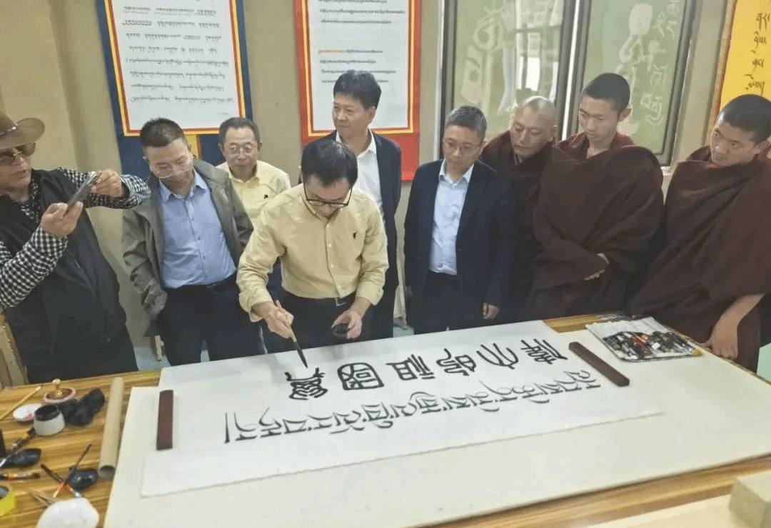 免费色情片 校友诗社副社长、温州市书法家协会副主席陈胜武与壤塘藏文书法家进行了现场书法交流藏汉文书写伟大的祖国万岁